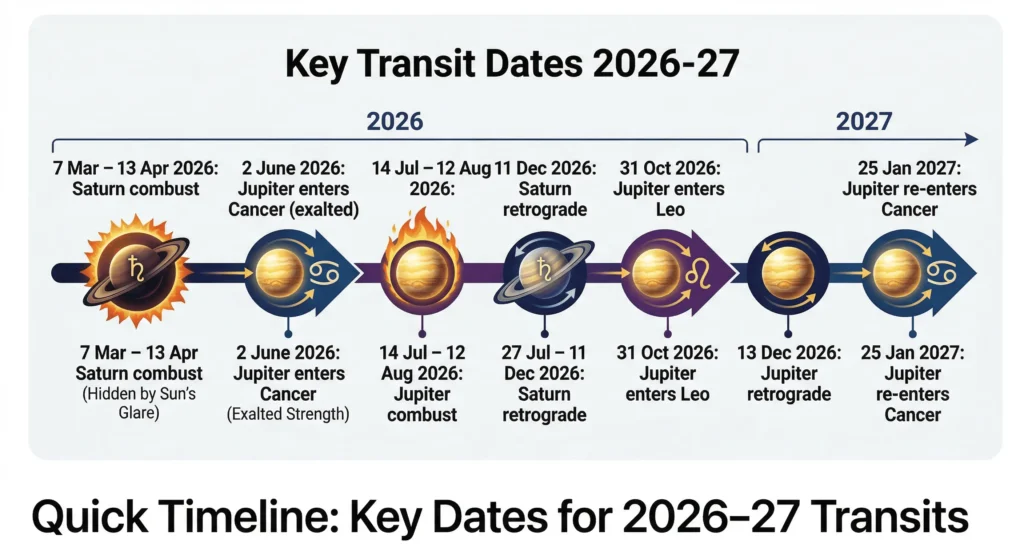 | Jupiter enters Cancer (exalted) | 2 June 2026, 2:25 AM IST | Most powerful Jupiter position |