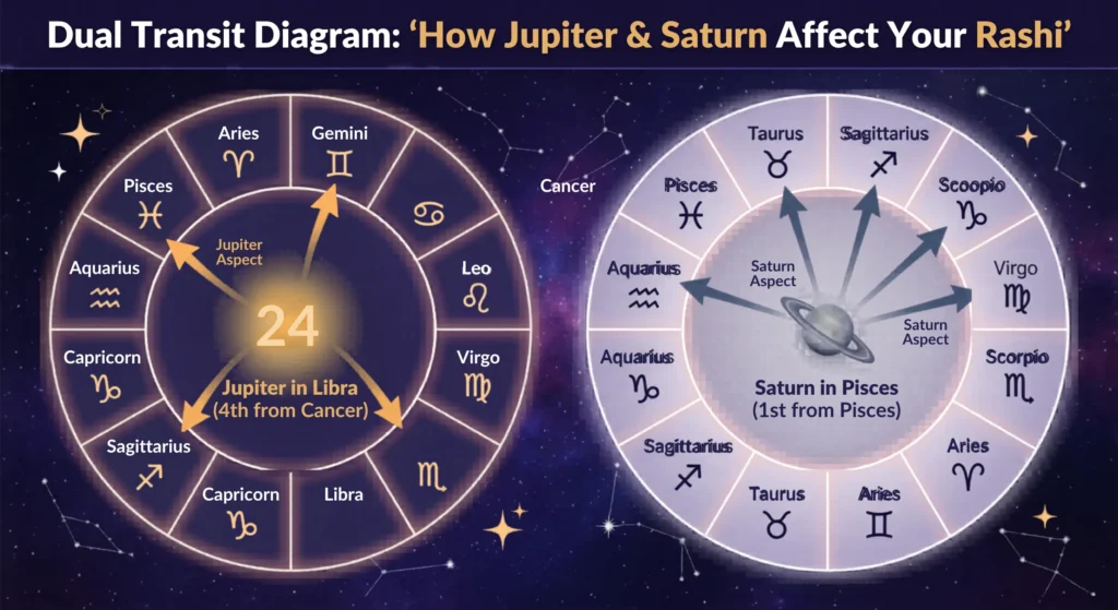 The years 2026–27 mark one of the most spiritually significant and transformative periods in Vedic astrology, with two major outer planets occupying their most powerful positions: Saturn staying in Pisces throughout 2026–27 and Jupiter moving into its exalted sign Cancer from 2 June to 31 October 2026. Even more powerful is the rare Jupiter-Saturn trine in water signs (Cancer-Pisces), creating a cosmic alignment that harmonizes expansion with discipline, dreams with reality, and faith with structure.