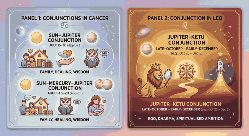 Around 16 July to 17 August 2026, creating a strong Guru–Aditya Yoga, often linked with dharma, authority, leadership and blessings when handled humbly. - Sun–Mercury–Jupiter triple conjunction in Cancer: