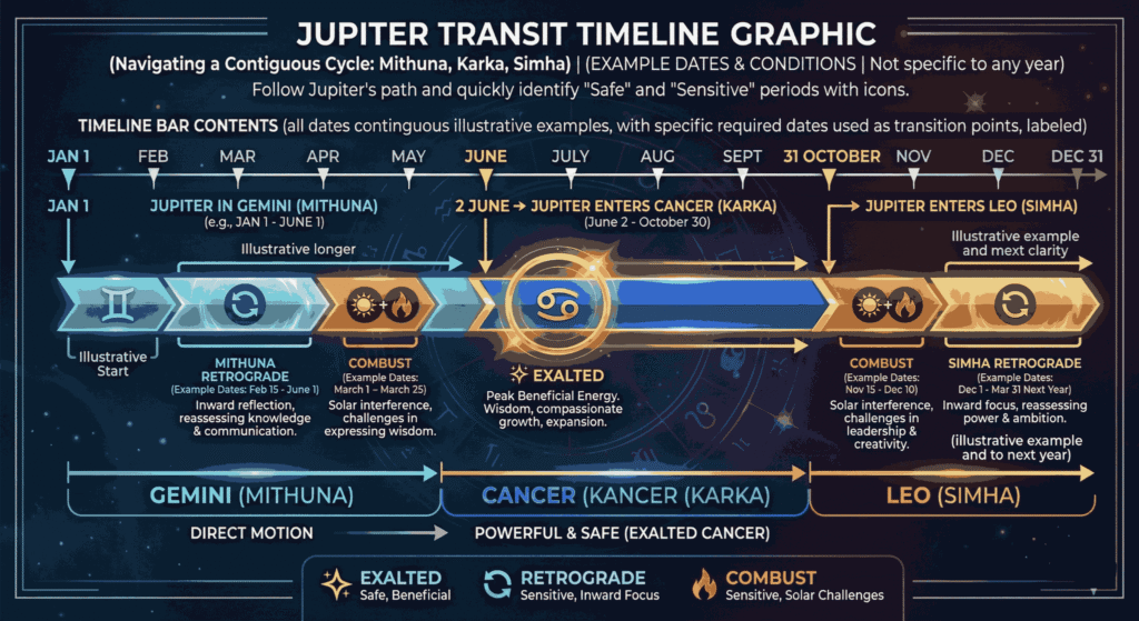 From an Indian context, note that a large part of this exaltation phase overlaps with a period when Jupiter becomes combust (too close to the Sun), approximately mid‑July to mid‑August, during which many traditional astrologers avoid auspicious muhurta for major material beginnings.