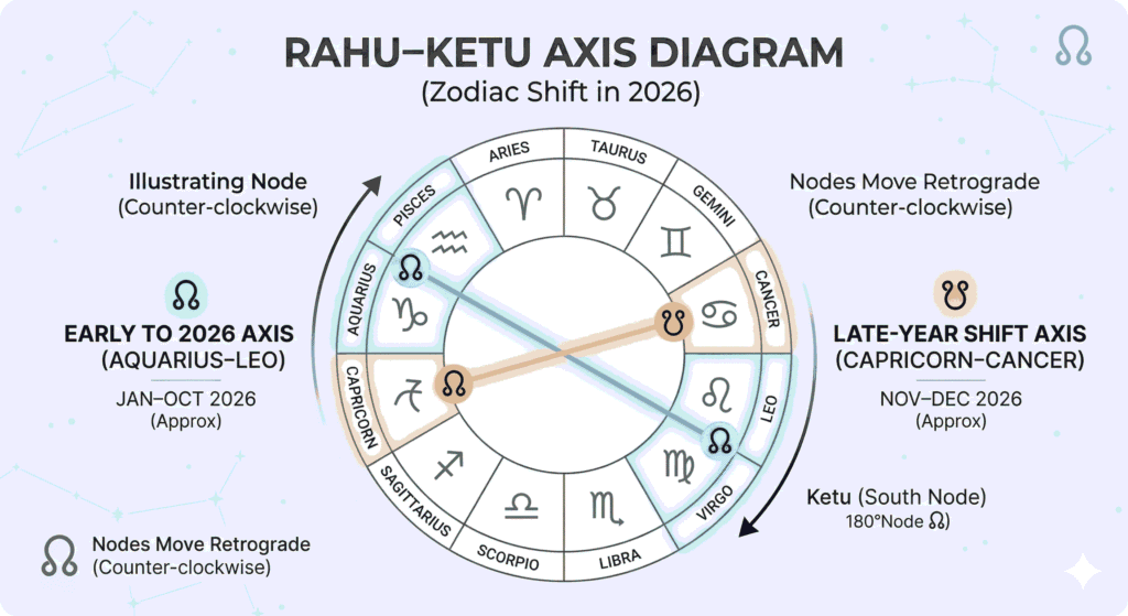 Rahu and Ketu spend most of 2026 in Aquarius and Leo and then shift to Capricorn and Cancer toward the end of the year, with commonly cited dates ranging from 26 November to around 5–7 December 2026 in different Vedic transit tables.