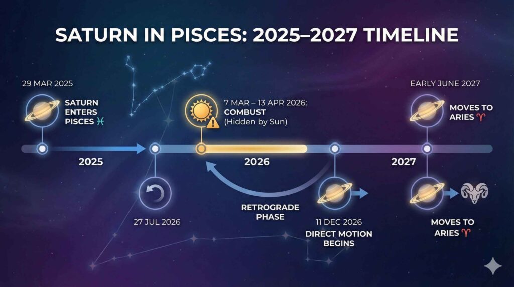 Authoritative transit tables show that Saturn enters Pisces on 29 March 2025 and stays there till early June 2027 before briefly moving to Aries.